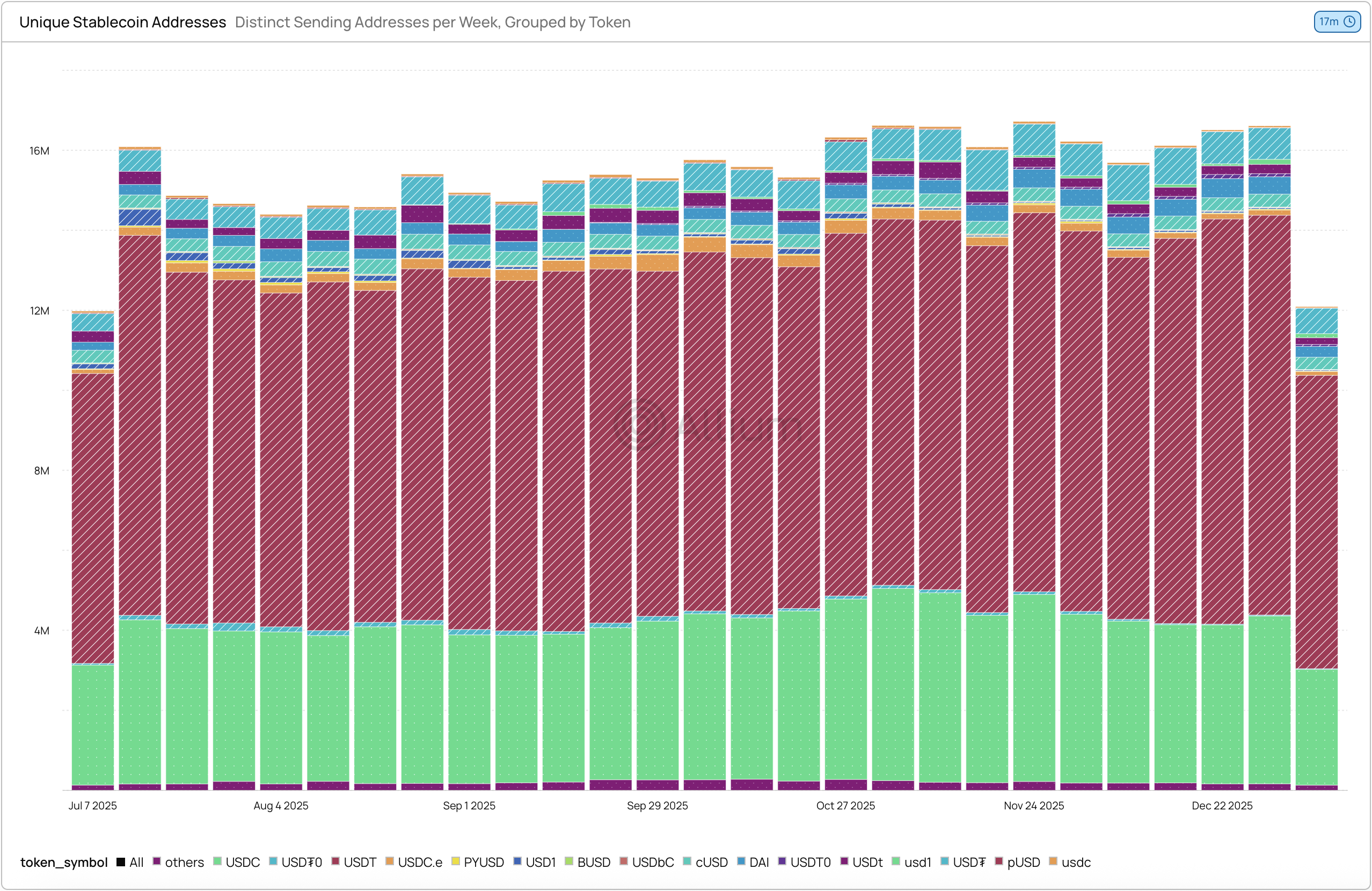Get the weekly unique addresses of USD stablecoins, showing the distribution of transfer activity across different stablecoins in the last 6 months