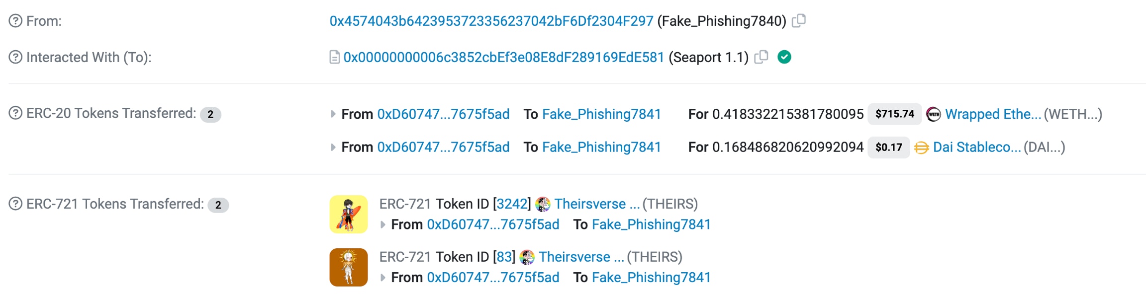 The flexibility of Seaport means that there are infinite combinations of trade setups that can happen. As a result, it is possible to have multiple currencies offered for an NFT trade. This constitutes a small fraction of all Seaport trades. When a seaport transaction consists of mixed trades of tokens/NFTs, it is also difficult to attach a price to an NFT traded within the mixed trade. The set-up becomes more like a barter trade.Phising Transactions