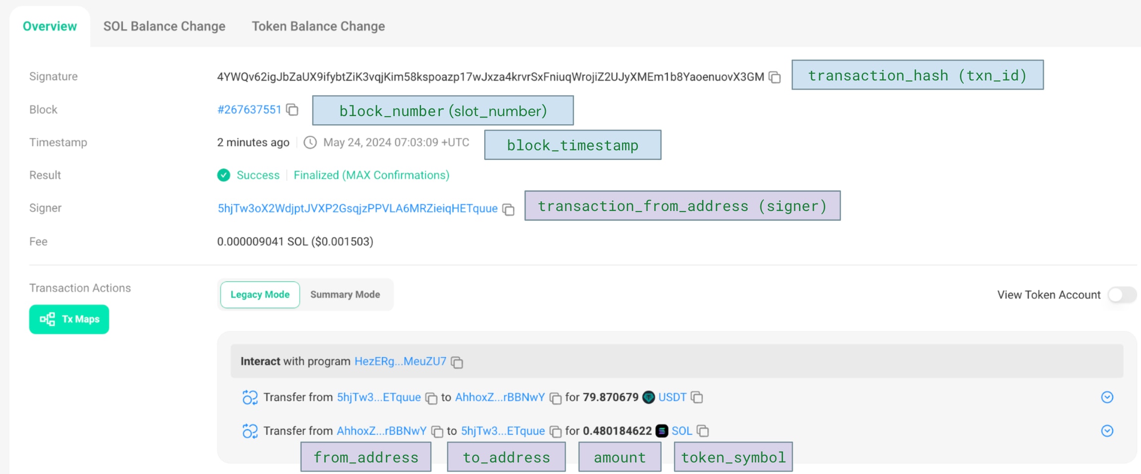 transaction_from_address | The address of the sending party of this transaction. (Solana: maps to transaction signer) |
